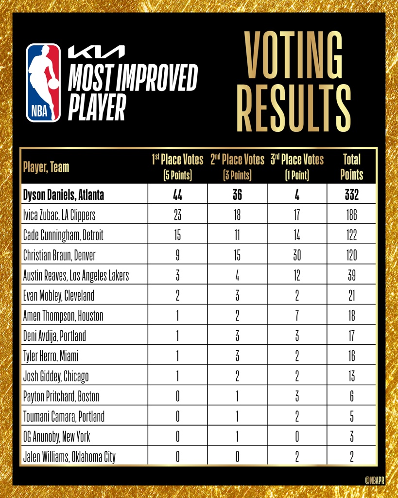 05月01日讯 NBA官方公布了本赛季进步最快球员,老鹰后卫戴森-丹尼尔斯当选。