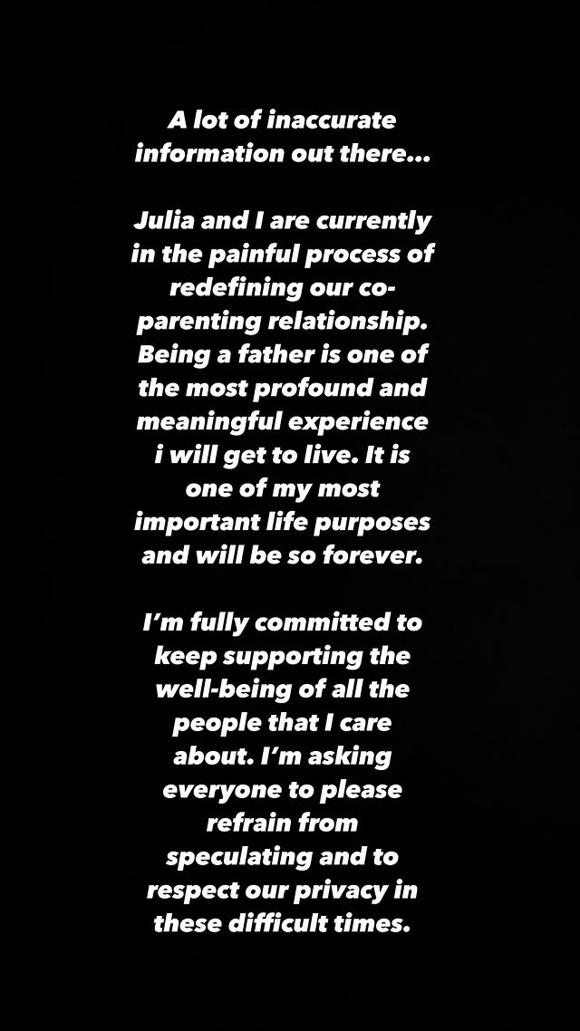 Julia Bonilla在社媒发布声明,她表示为了孩子会维护戈贝尔的名声,同时坚定表示从未对孩子的父亲不忠。