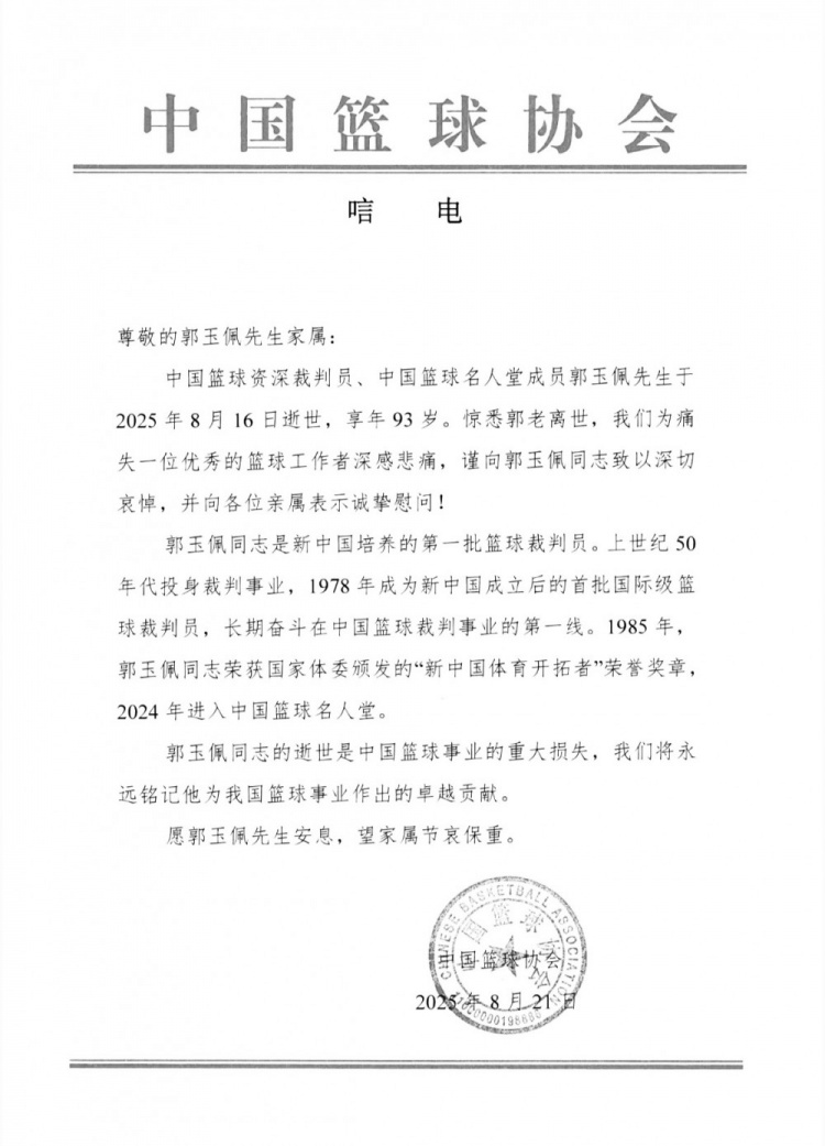 中国篮球资深裁判员、中国篮球名人堂成员郭玉佩先生于2025年8月16日逝世,享年93岁。惊悉郭老离世,我们为痛失一位优秀的篮球工作者深感悲痛,谨向郭玉佩同志致以深切哀悼,并向各位亲属表示诚挚慰问!