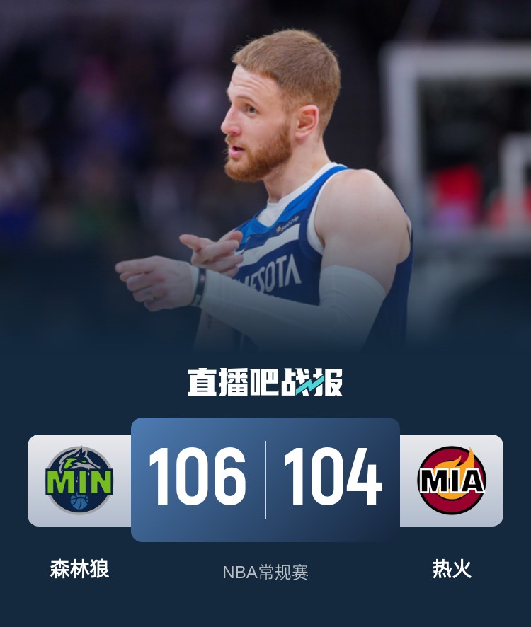 此役一上来双方便陷入缠斗,阿德巴约连投带罚不断取分,兰德尔联手康利及时回应,森林狼中段开始发力确立优势,首节结束时森林狼领先8分,次节回来,森林狼始终保持领先,但末段他们进攻突然断电,热火顺势抹平分差,半场战罢,两队战成52平。易边再战后森林狼再度发力将分差拉开到两位数,阿德巴约和希罗内外结合强势回应,双方战成80平进入末节,末节决战,两队鏖战至最后时刻,里德和麦克丹尼尔斯连中抛投,森林狼连丢罚球后阿德巴约三分绝杀未果,最终森林狼106-104涉险过关。