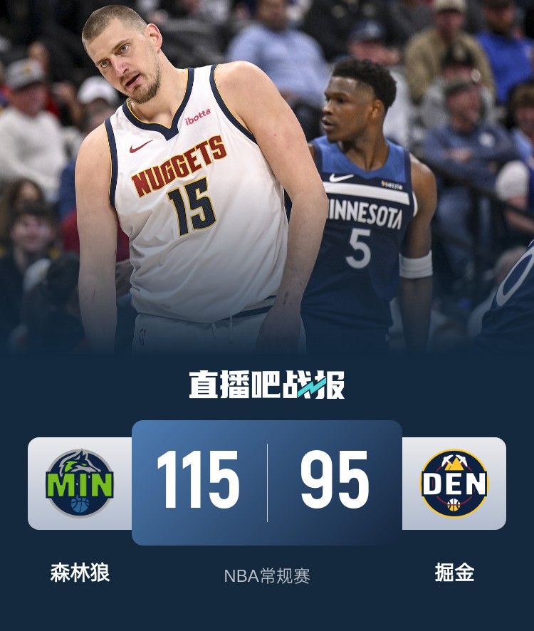 首节开局森林狼反客为主以一波14-4的攻势抢占先机,早早进入状态的他们手感保持一整节,他们首节以50%的命中率并命中5记三分打得掘金毫无办法,后者除了约基奇超强实力砍下15分外大部分人都发挥失常;次节森林狼状态有所回落但掘金也没能抓住机会,双方前5分钟里都只拿到9分;后半段双方相继回暖但森林狼一直占据上风并带着9分优势进入下半场。休息归来森林狼依旧稳定输出一直保持着10分左右的领先;掘金防守端糟糕的发挥导致了约基奇三节31分都无力扭转局面;末节兰德尔和里德相继命中三分将优势拉大至20分以上早早奠定胜局。最终,森林狼客场再胜掘金,目前三次交手三杀对手。
