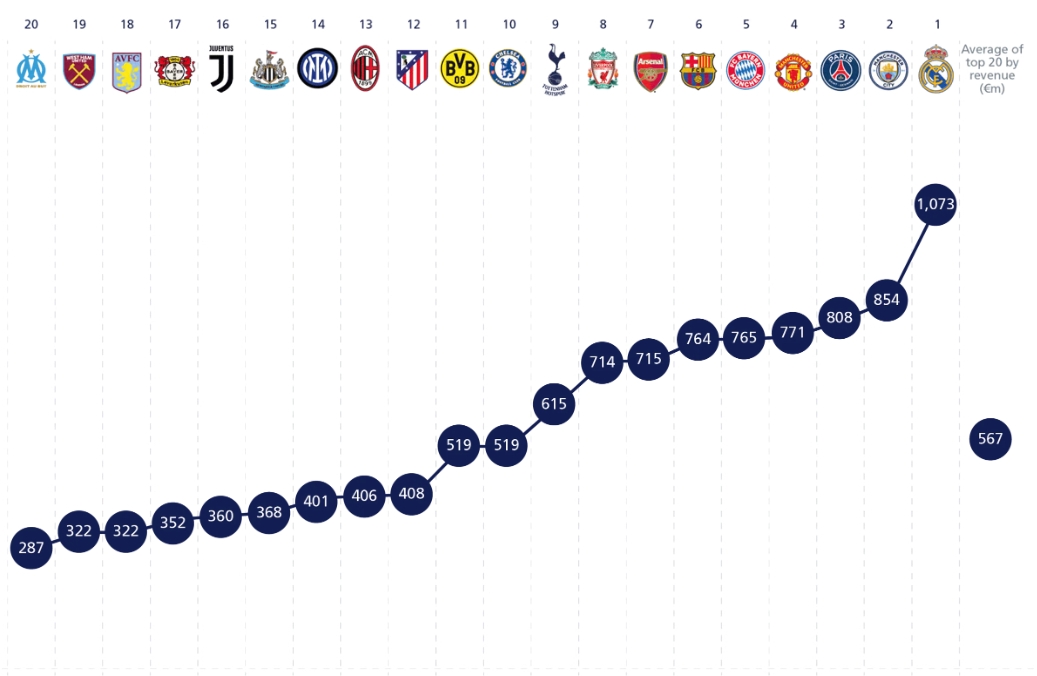 2024欧洲俱乐部总收入排行前20(单位:欧元):