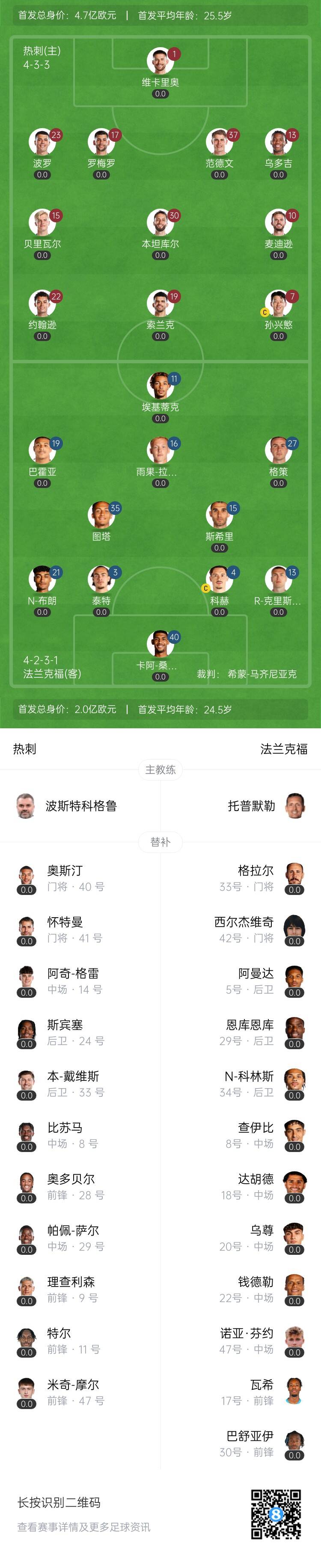 热刺首发:1-维卡里奥、23-波罗、17-罗梅罗、37-范德文、13-乌多吉、30-本坦库尔、15-贝里瓦尔、10-麦迪逊、22-布伦南-约翰逊、7-孙兴慜、19-索兰克
