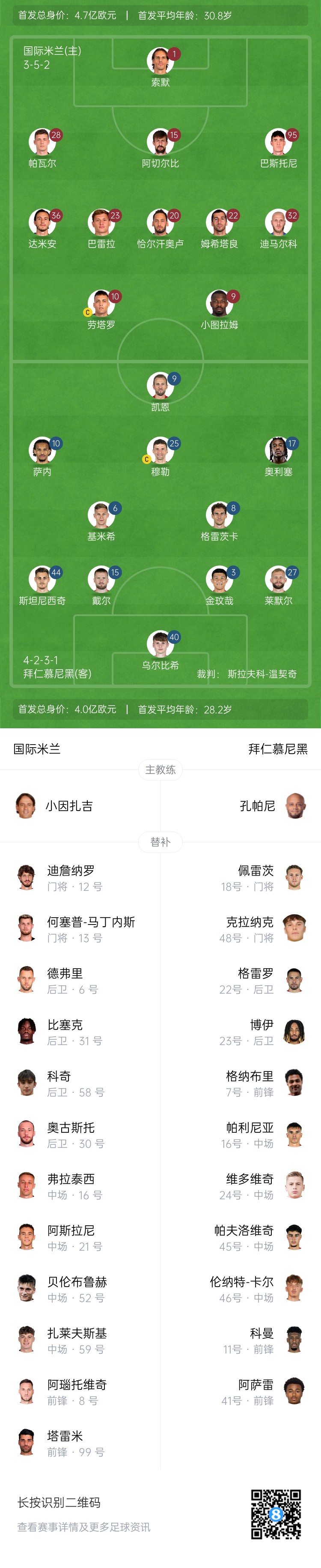 国米首发:1-索默、95-巴斯托尼、28-帕瓦尔、15-阿切尔比、32-迪马尔科、23-巴雷拉、20-恰尔汗奥卢、22-姆希塔良、36-达米安、9-图拉姆、10-劳塔罗
