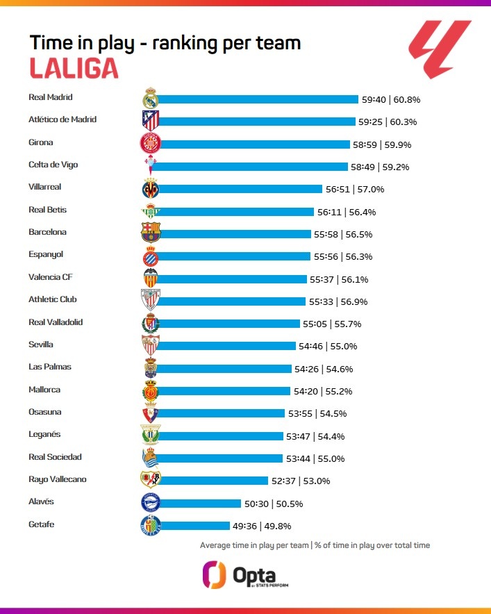 5月27日讯 本赛季西甲联赛已经落幕,数据平台OPTA统计了本赛季西甲各队的场均净比赛时长,其中皇马以59分40秒居首,马竞59分25秒其次,巴萨55分58秒排在第7位。