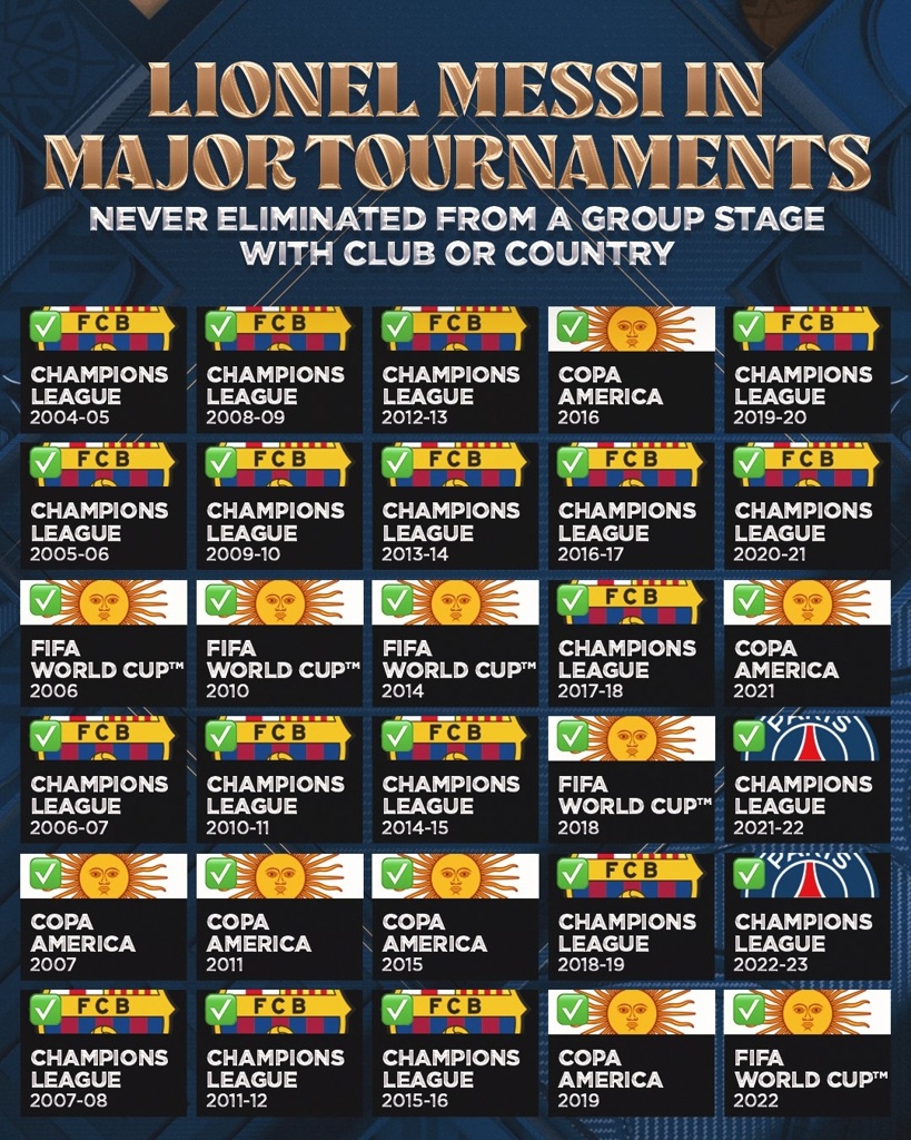 梅西延续了自己职业生涯小组赛全部晋级的铁律,阿根廷媒体统计了梅西生涯共36次小组赛晋级的分布情况,包含33次成年比赛晋级以及3次国奥队&U-20赛事晋级。