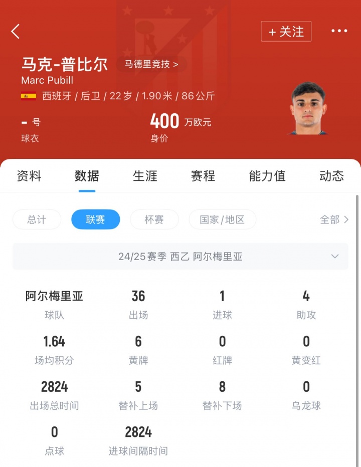 马克-普比尔现年22岁,身高1.9米,司职右后卫,德转身价400万欧。上赛季他在西乙为阿尔梅里亚出场36次,贡献1球4助攻。