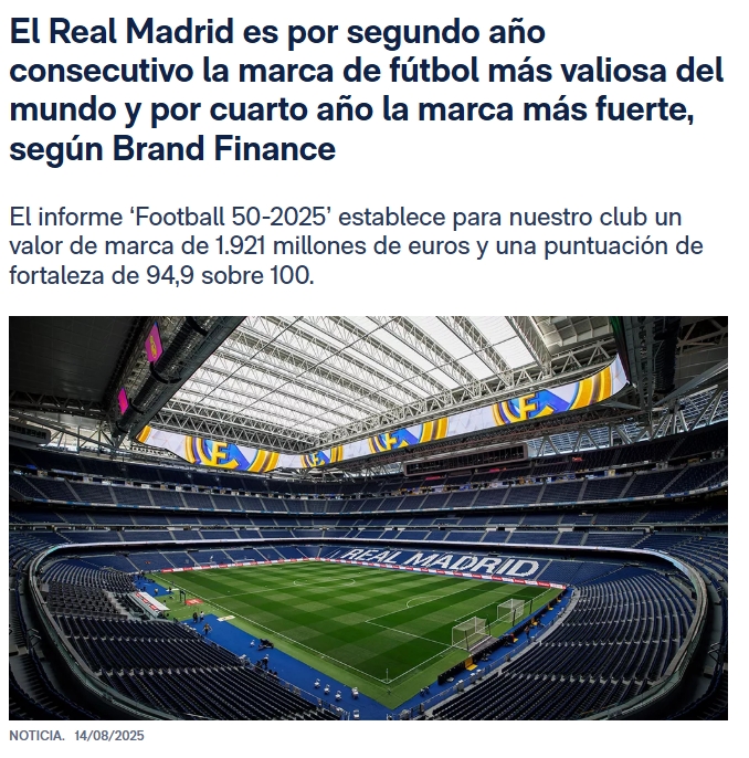 根据品牌评估机构Brand Finance发布的《Football 50-2025》年度报告,皇家马德里连续第二年成为全球最具价值足球品牌,并连续第四年保持全球最强足球品牌地位。我俱乐部品牌价值增长14%,创下19.21亿欧元的新纪录。