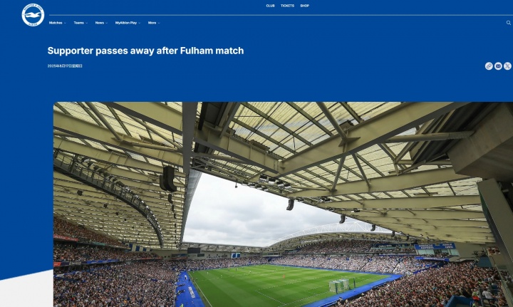 布莱顿官网写道:“在对阵富勒姆的比赛结束后,我们悲痛地宣布一名72岁的男性球迷不幸离世。这位先生在比赛下半场于东看台上层突发不适,尽管急救人员、俱乐部工作人员及医疗团队全力抢救,仍未能挽回他的生命。”