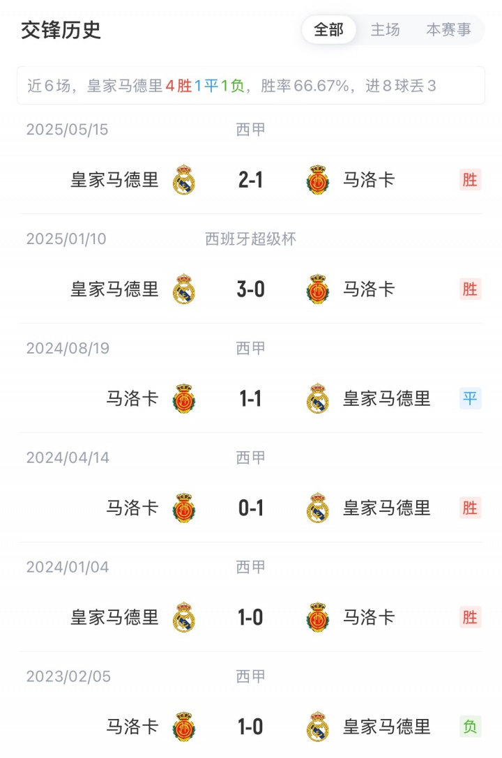 皇马开局两连胜暂排第三,马洛卡则是1平1负。皇马面对马洛卡已五场不败。