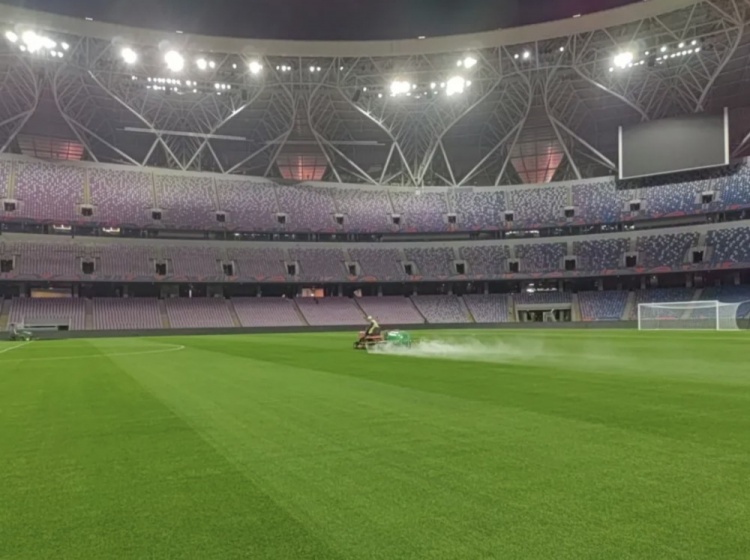 草坪养护专家李龙保介绍,根据本阶段世预赛竞赛要求,整个球场的草坪修剪高度要严格控制在25mm,草坪的基础平整度极为严格,3米内的高差必须控制在5mm以内,整个场地的坡度差要在千分之三以内。“我们用的高精度北斗导航精细平地机控制平整度,能够根据导航自动找平调平种植层平整。”